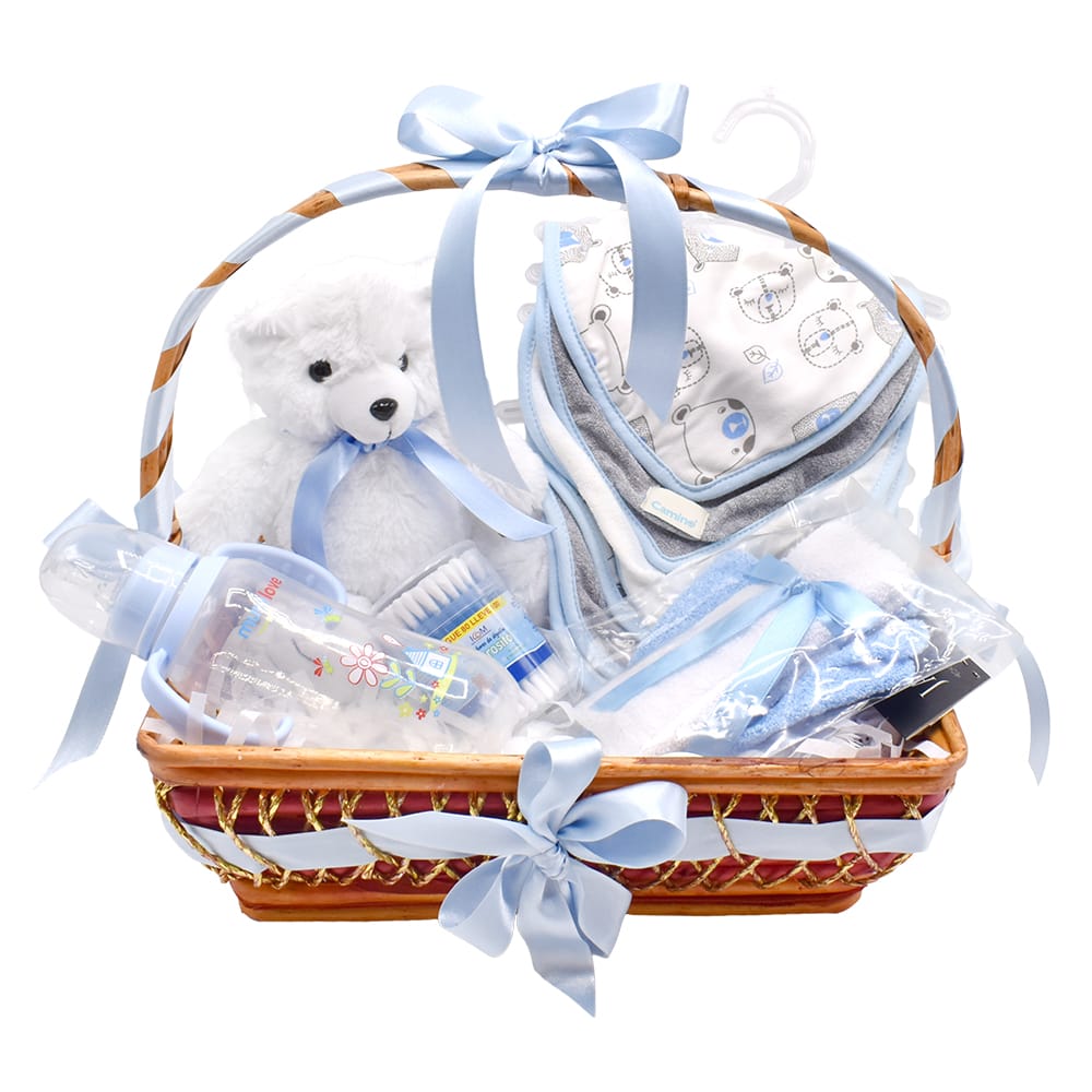 En The Gift Company todos las Canastillas para Bebé se entregan completamente decorados con Papel Transparente Importado, Moño y Tarjeta Personalizada.